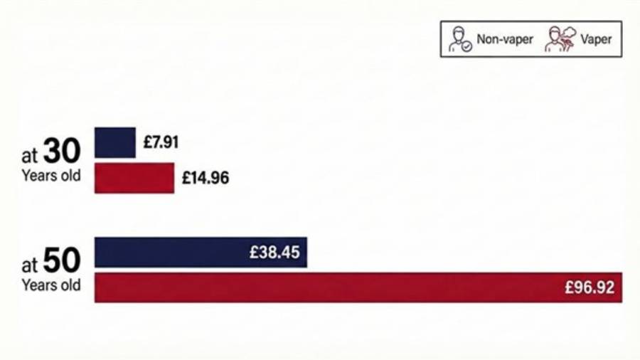 Below is an illustration of how life insurance premiums compare between vapers and non-vapers (which includes non-smokers). This data is for customers at 30 and 50 years old taking out £100,000 worth of cover over a 25-year term. Both are non-drinkers and all variables other than vaping status are the same.